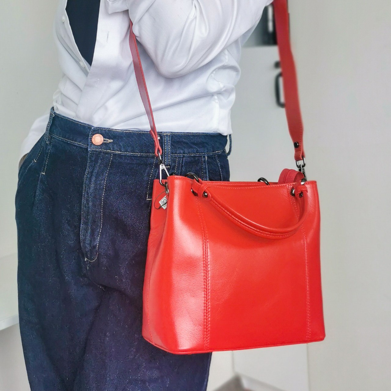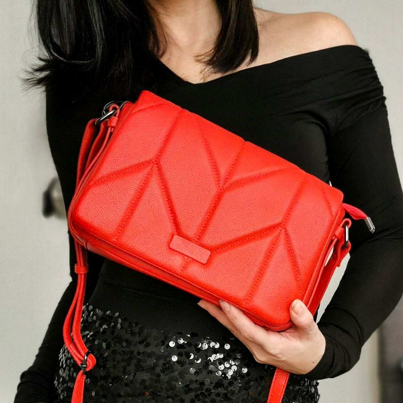 Яркие акценты: Красный цвет прекрасно сочетается с синим, зеленым, желтым. Добавьте в образ яркий топ или брюки в тон сумки, чтобы создать яркий и смелый стиль.