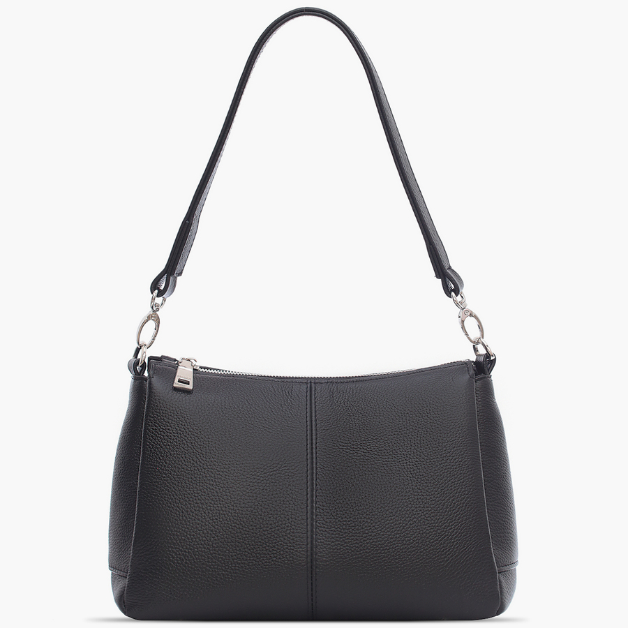 Изящная сумочка из мягкой кожи, закрывается на молнию, с тремя автономными отделами. Носится в руке или через плечо. Высота ручки 24 см. Снаружи: на задней стенке карман на молнии. Внутри: карман на молнии для документов и два открытых кармашка для телефона и мелочи.