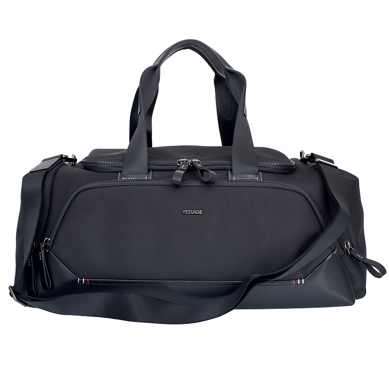 Дорожная кожаная сумка чёрного цвета от Verage - идеально подойдёт для путешествий и занятий спортом. Выполнена из качественного полиэстера с элементами кож.зама. Сумка закрывается клапаном на двустороннюю молнию, внутри два кармашка для мелких предметов и карман для документов на молнии. Снаружи расположены функциональные карманы для эффективной организации пространства (4 внешних кармана на молнии). Оснащена двумя удлинёнными регулируемыми ручками и съёмным регулируемым плечевым ремнём (60 см) на карабинах.